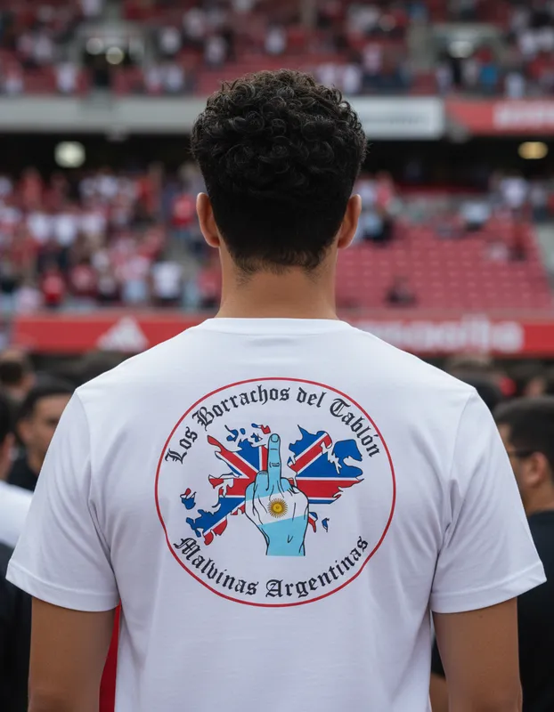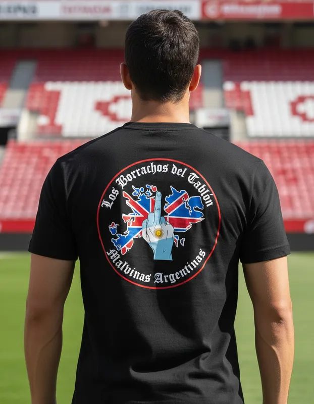 En la espalda lleva las Islas Malvinas y la mano haciendo “Fuck You” inspirada en la emblemática bandera de Los Borrachos del Tablón.